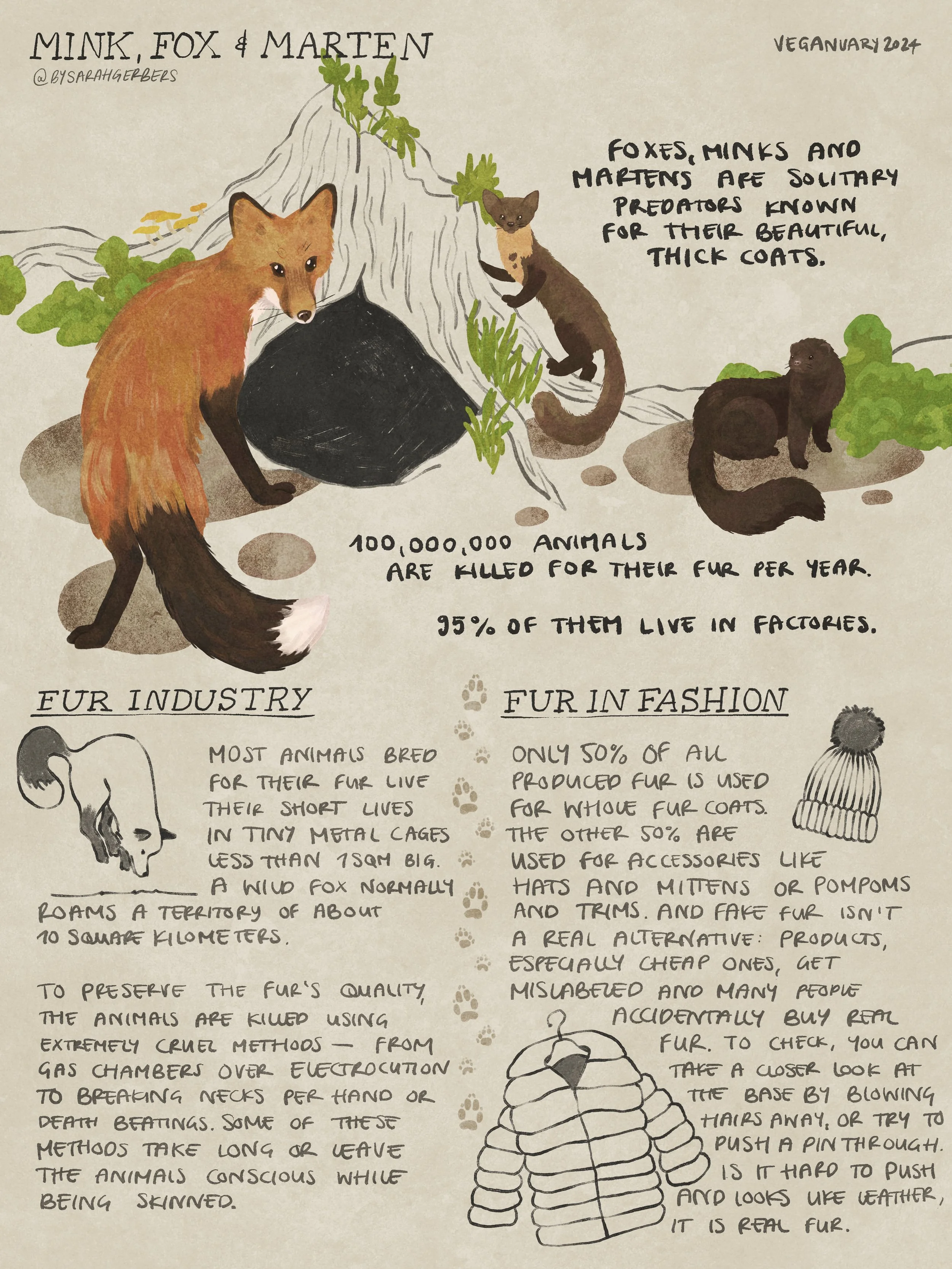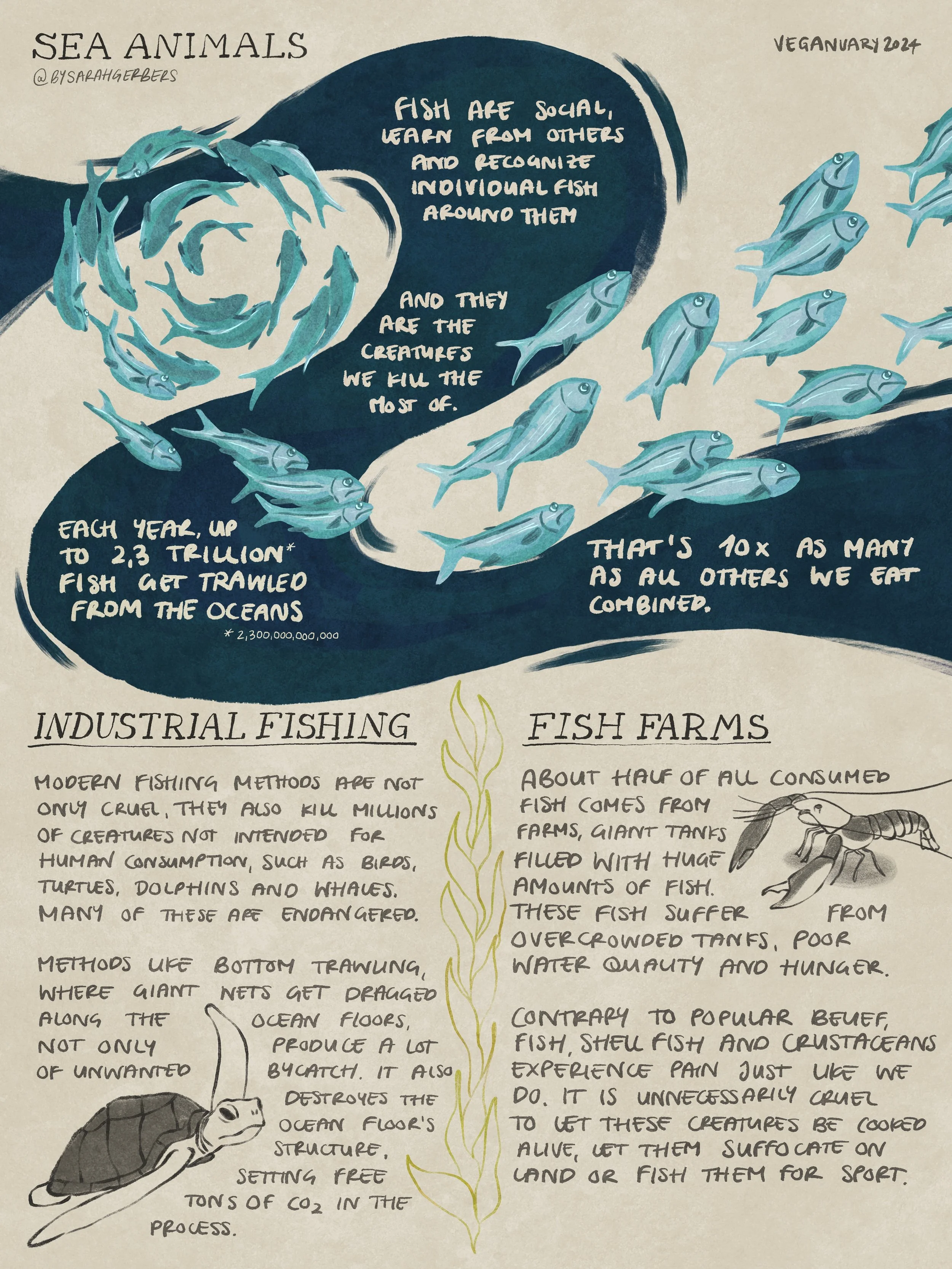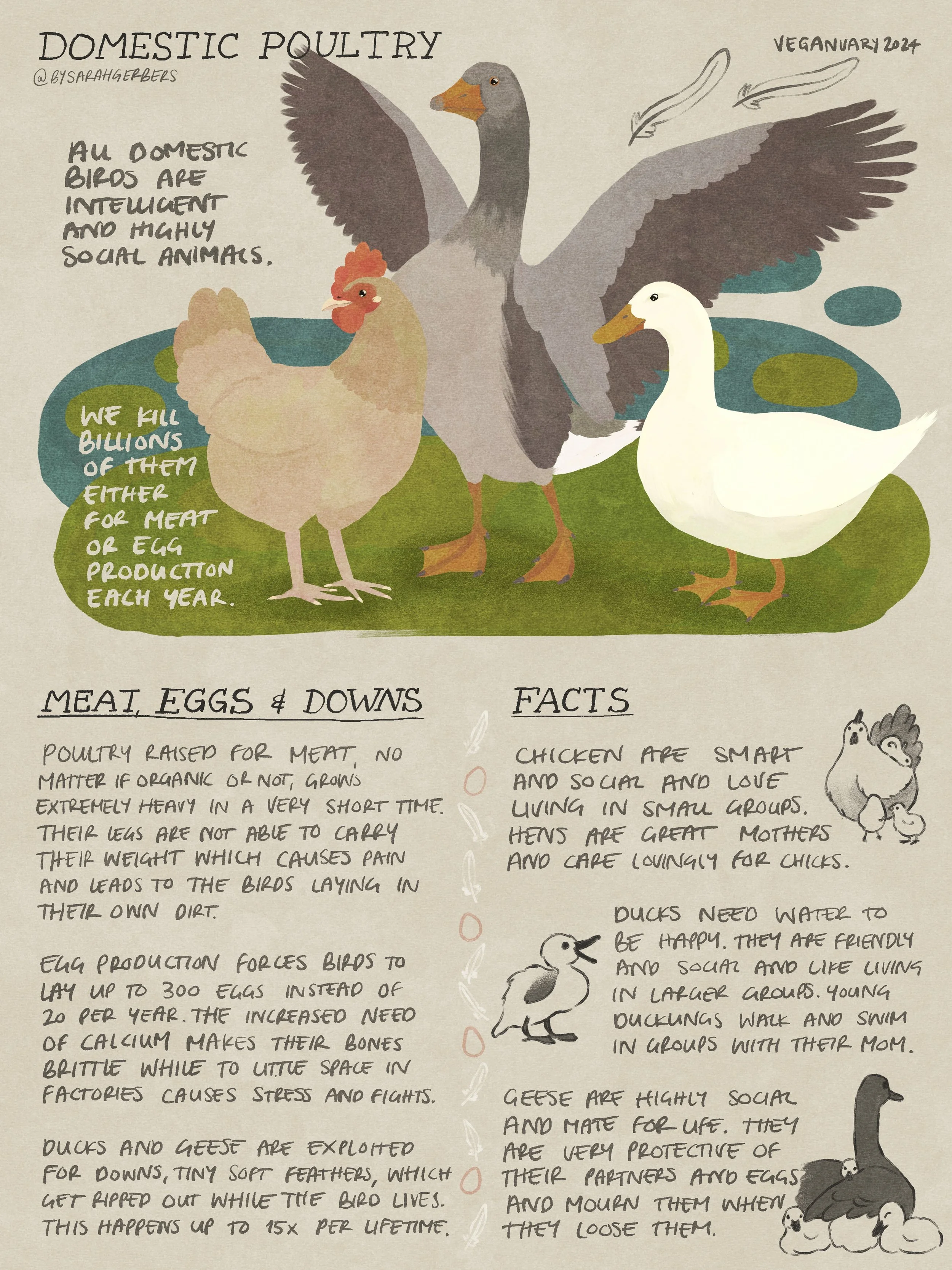 Im Rahmen der Veganuary Challenge, die nicht-vegan lebenden Menschen an einen Lebensstil mit reduziertem Tierprodukt-Konsum heranführen soll, sind sieben illustrierte Poster entstanden, die das Leid verschiedener (Nutz-)Tierarten aufzeigt und in Kontext setzt.